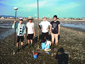 渡辺教授が所長を務める水循環・生態系再生研究所では、『堆積ヘドロを分解 → 分解された有機物を二枚貝が摂取 → 成長した二枚貝を自然の恵みとして人間が消費する』 という通常の食物連鎖の再生を目指して、研究をスタートさせました。共同研究を実施しているコヨウ株式会社より提供されたフルボ酸鉄シリカ資材はヘドロ分解に効果があり、研究室内での水槽実験において、分解されたヘドロが植物プランクトンにより摂取され、投入したアサリがそのプランクトンを摂食して成長していることが確認されました。この結果を受けて、平成27年7月より熊本県長洲町沿岸干潟に同資材を設置して二枚貝生息状況のモニタリングを実施しています。